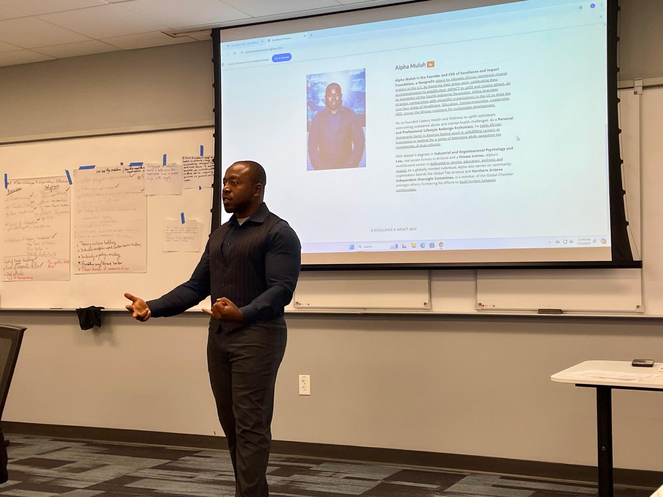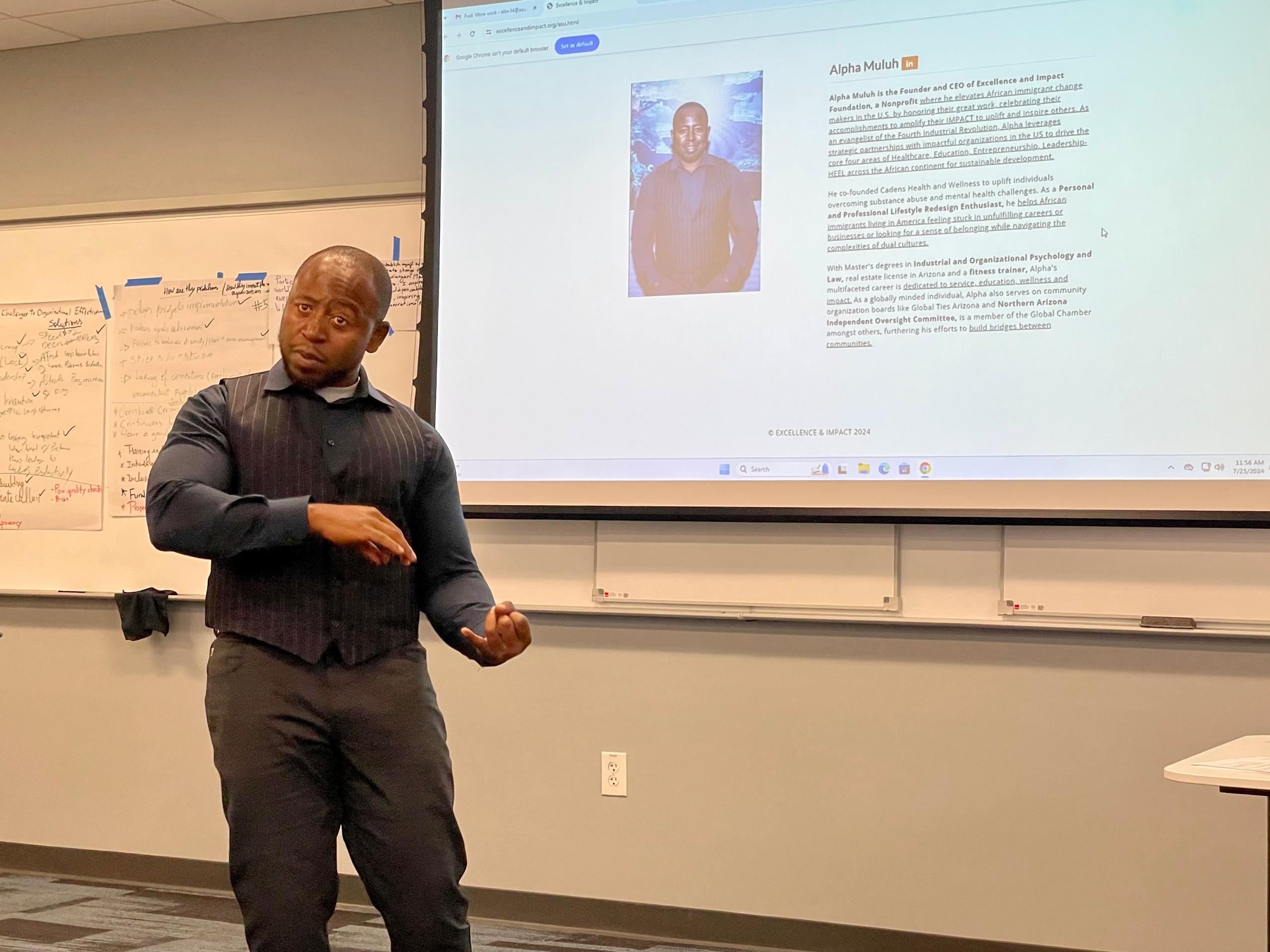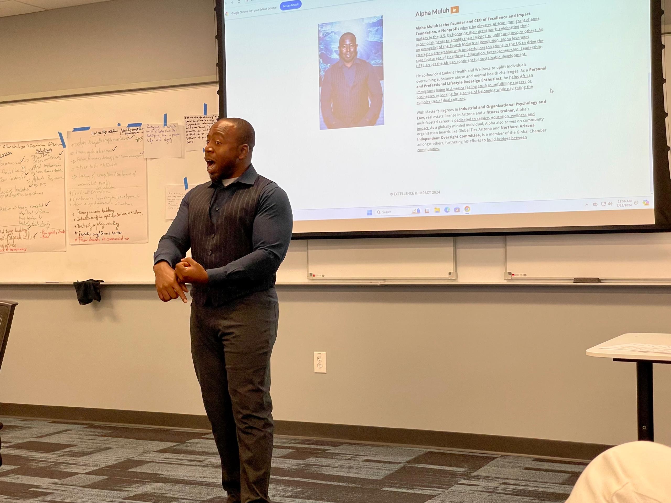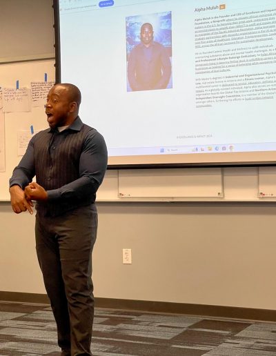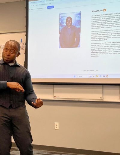 Alpha Muluh is the visionary Founder of the Excellence and Impact Foundation Nonprofit, where he elevates African immigrants living in the U.S. by giving them a voice, increasing their visibility, and celebrating their accomplishments. With a multifaceted career dedicated to service, education, and wellness, Alpha holds Masters degrees in Industrial and Organizational Psychology and Law.